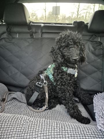 Autofahren: Scheint sie zu lieben, liegt angeschnallt auf der Rücksitzbank oder dem Beifahrersitz, beim Anhalten steht sie mal auf, um zu schauen, aber legt sich sofort wieder hin, wenn es weitergeht